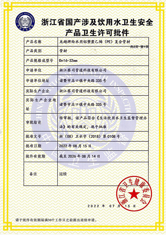 • 鋁塑管衛生(shēng)許可2022-2